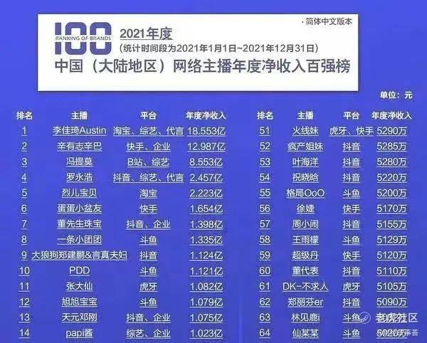 据斯坦福大学海外商业课题研究组&全球化与世界城市研究网络城市经济专题组联合发布的数据显示,2021年,中国大陆地区网络主播年度净收入排行榜中,李佳琦排名第一,年入18.553亿——折算下平均每天500万。
