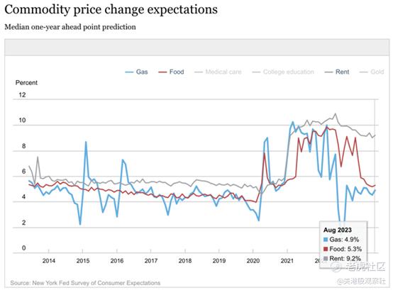 消费者对未来一年的生活费用最担心的问题是租金。他们认为租金将上涨超过9%,这也是导致一年期中位数预期达到3.6%的原因。然而,现实情况是,租金不太可能有任何上涨。
