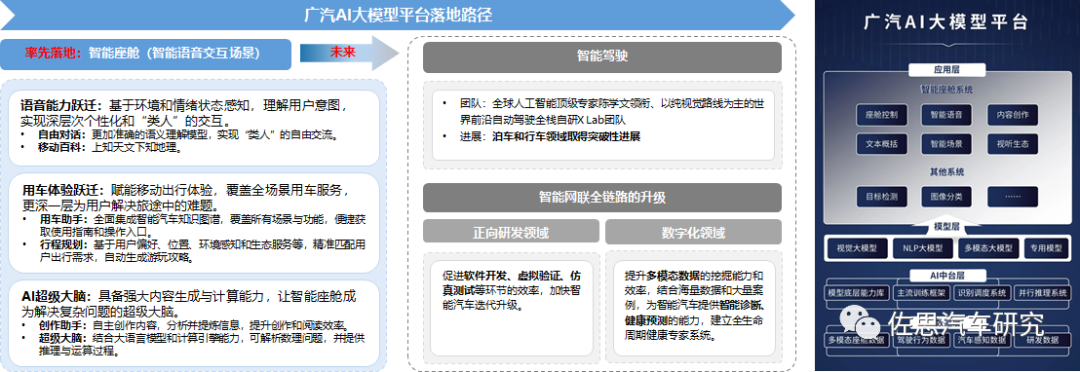 2023年8月,广汽推出广汽AI大模型平台。该平台将率先落地智能语音交互场景。基于该平台,智能语音可结合各种模型优势,运用车端本地推理能力和云端混合模型技术,实现“精准的上下文语义理解”;并结合广汽魔方场景共创平台与云端生态服务,全面提升语音的智能化和情感化,将“一问一答”的形式升级为无门槛、直觉式的自然对话,将率先搭载于昊铂GT车型上。