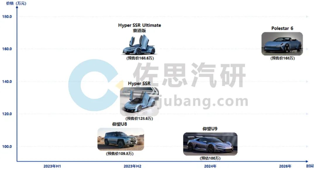 从价格区间来看,各车企仍将10-30万元价格段作为主要发力市场。但随着品牌高端化发展,部分主机厂将进入百万级豪华车市场。例如,预售价109.8万元的比亚迪首款纯电SUV仰望U8、预估价在100万元左右的比亚迪纯电跑车仰望U9、预售价128.6-168.6万元的广汽埃安超跑Hyper SSR、预估价100万元左右的问界纯电MPV车型、预售价168万元的极星Polestar 6等车型,成为自主品牌向上进阶的进一步探索。