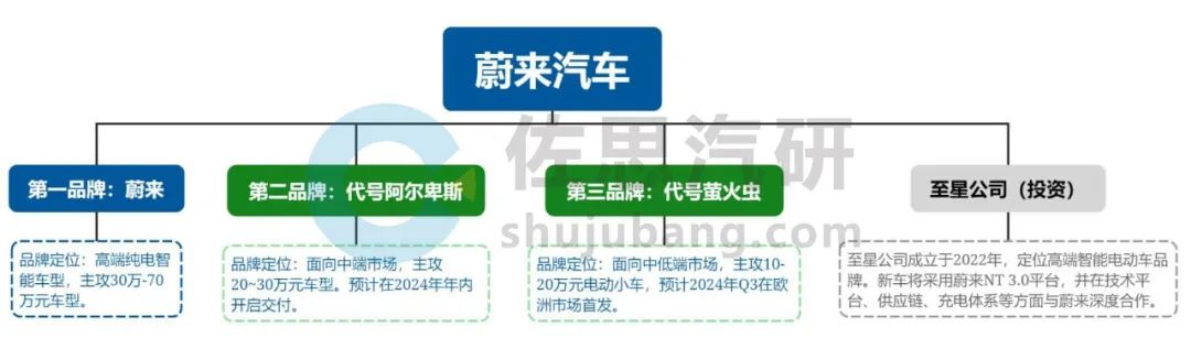 蔚来将在2024年陆续推出第二品牌——(代号)阿尔卑斯、第三品牌——(代号)萤火虫,与蔚来品牌形成品牌矩阵,覆盖10-70万级的低中高端汽车市场。