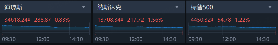 周五,美股集体低开低走,截至收盘,标普500跌1.22%,报4450.32点,本周累计下跌0.16%;纳斯达克指数跌1.56%,报13708.34点,本周累计下跌0.39%;道琼斯工业指数跌0.83%,报34618.24点,本周累计上涨0.12%。