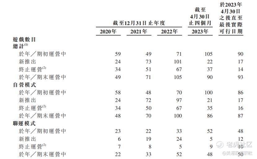 随着公司的持续经营开拓,中旭未来的游戏产品组合不断扩大,自公司成立以来,公司已经营销和运营了超过310款游戏产品,截至2023年4月30日,公司在运营中的产品达到90款。其中,自营模式不断增长,而联运模式以更快地速度增加,截至2023年4月30日达到48款,联运自营比达到0.56。尽管相比自营模式,联运模式下公司需要给分销渠道分享收入,毛利率更低,但是公司可以借助分销渠道实现游戏产品更快速地推广和增长,单个游戏产品的成功率大大增加,更有助于公司游戏品牌的塑造。
