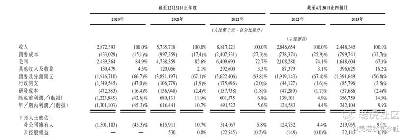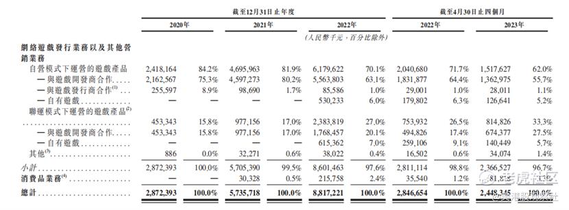 在财务方面,中旭未来表现出了强大的成长能力。2020年到2022年,中旭未来收入分别达到28.7亿、57.4亿以及88.2亿元,年复合增长率达75.2%。截至2023年4月30日的四个月,公司收入为24.5亿元,同比下降了14.0%,这主要是受到自营业务中成熟游戏进入到了衰退期的影响,而联运业务收入和消费品业务都处于快速增长阶段。