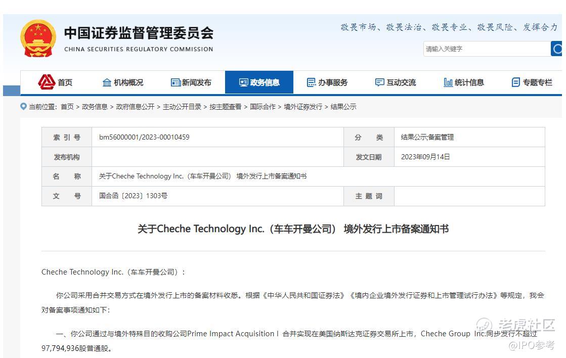 【车车科技借壳赴美上市获备案通知】9月14日,证监会发布关于Cheche Technology Inc.(车车开曼公司,CCT)境外发行上市的备案通知书。内容显示,车车开曼公司通过与境外特殊目的收购公司Prime Impact Acquisition I (PIAI)合并实现在美国纳斯达克交易所上市,Cheche Group Inc.同步发行不超过9779.49万股普通股。同时,证监会提出,自备案通知书出具之日起至本次境外发行上市结束前,车车开曼公司如发生重大事项,应根据境内企业境外发行上市有关规定,通过中国证监会备案管理信息系统报告。如车车开曼公司自备案通知书出具之日起12个月内未完成境外发行上市,拟继续推进的,应当更新备案材料。(界面)
