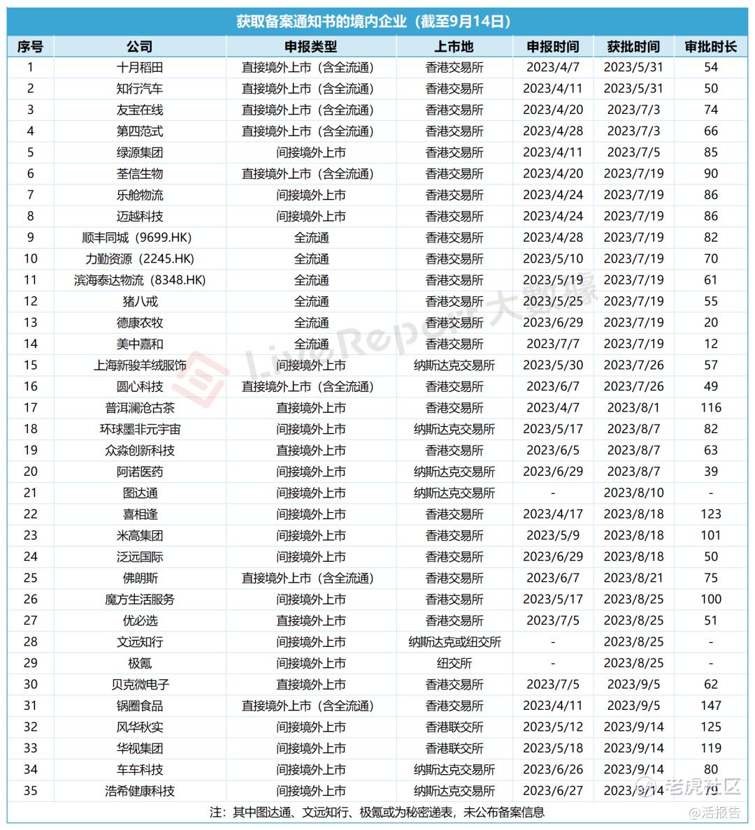 截至9月14日,共有35家境内企业获得境外上市备案通知书,分别是知行汽车、十月稻田、友宝在线、第四范式、绿源集团、顺丰同城、美中嘉和、力勤资源、猪八戒、天津滨海泰达物流、德康农牧、荃信生物、迈越科技、乐舱物流、上海新骏羊绒服饰、圆心科技、普洱澜沧古茶、环球墨非元宇宙、众淼创新科技、阿诺医药、图达通、喜相逢、米高集团、泛远国际、佛朗斯、魔方生活服务、优必选、文远知行、极氪、贝克微电子、锅圈食品、风华秋实、华视集团、车车科技、浩希健康科技。