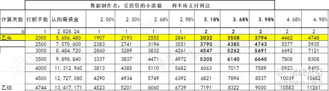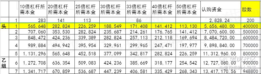 乙组头,这次是 566万认购资金,乙组的各档融资所需要的本金还有融资金额对应如下表: