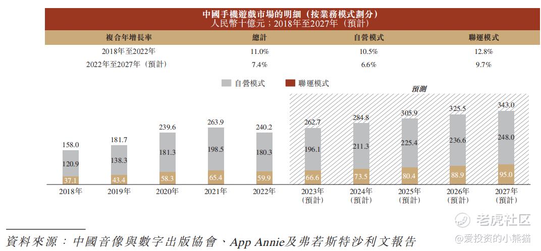 自营模式下的手机游戏近年占手机游戏市场的大部分,但联运模式下的手机游戏市场规模迅速增长。联运模式下的手机游戏市场规模以12.8%的复合年增长率快速增长,由2018 年的人民币371亿元增加至2022年的人民币599亿元,并预期于2027年将达到人民币950亿元, 2022年至2027年的复合年增长率为9.7%。
