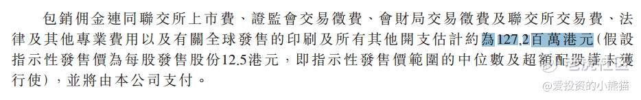 然后这个票招股书上按发售价的中位数12.50港元计算,公开的上市所有开支总额约为1.27亿港元,募资额约2.37亿港元,占比约53.59%,开支相比募资额算是比较多的了,超过5成了。