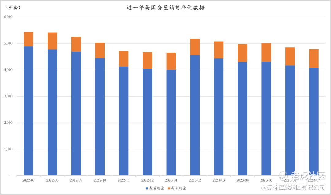 从历史数据来看,新屋销售只占全部房屋销售的10%-20%左右,决定市场房屋库存的仍然是占80%体量的二手成屋市场。自房价从去年夏天的高点开始回调以来,成屋销售一路走低,二手房年化销售量从490万套减少至400万套,同期新屋年化销售量仅从55万套增加至70万套。截至2023年7月底,美国成屋库存为110万套(约为疫情前的一半),新房库存为43.7万套(两年来最低水平),市场总体库存在150万套的水平。而根据美国房地产估价网站Zillow的分析,美国还需要430万套住房才能达到供需平衡,这说明目前美国住房市场供需严重不平衡。