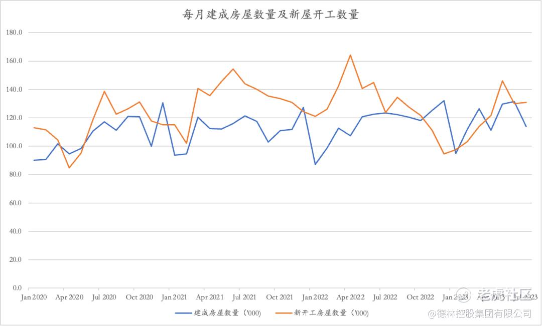 图7: 2020年以来每月建成房屋数量和新屋开工数量,来源:FRED