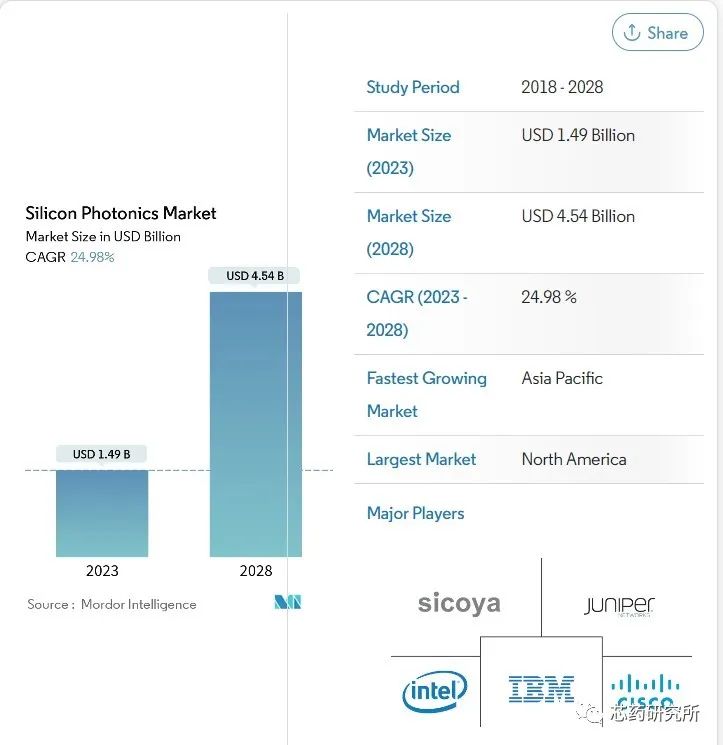 知名研究机构Mordor Intelligence预测数据则较为保守,2023年硅光子市场规模预计为14.9亿美元,该机构预计到2028年将达到45.4亿美元,在预测期内(2023-2028年)复合年增长率为24.98%。