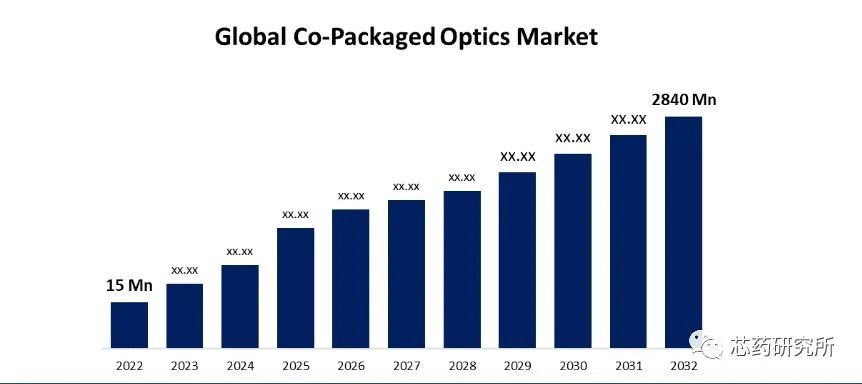 知名研究机构Spherical insights近日公布的研究报告显示,预计2022年至2032年全球共封装光学市场的复合年增长率为68.9%,预计到 2032年全球共封装光学市场预计将达到28.4亿美元,该机构测算的2022年市场仅为 1500 万美元。