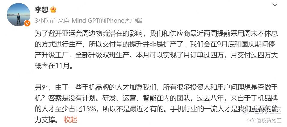 但是,根据理想汽车CEO李想的表述,交付量环比放缓主要是产能受限,其在社交平台表示,9月的订单已超4万,预计11月交付量将超4万!