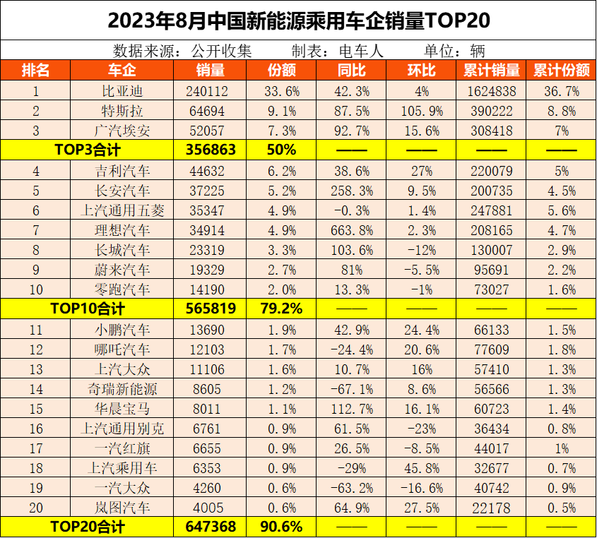 1、比亚迪销售24万辆,同比、环比分别+42.3%、+4%,市场份额33.6%,较7月下降2.4个百分点。
