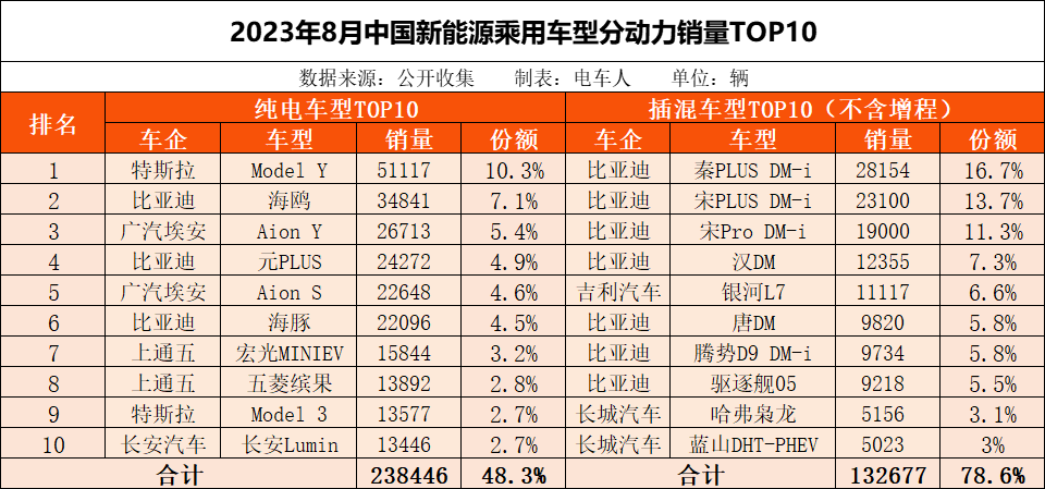 8月纯电动车型销售49.4万辆,同比增长25%,环比增长16%,其中Model Y销售5.1万辆,居第1名,TOP10车型中,比亚迪有3款,特斯拉、广汽埃安和上通五各有两款。