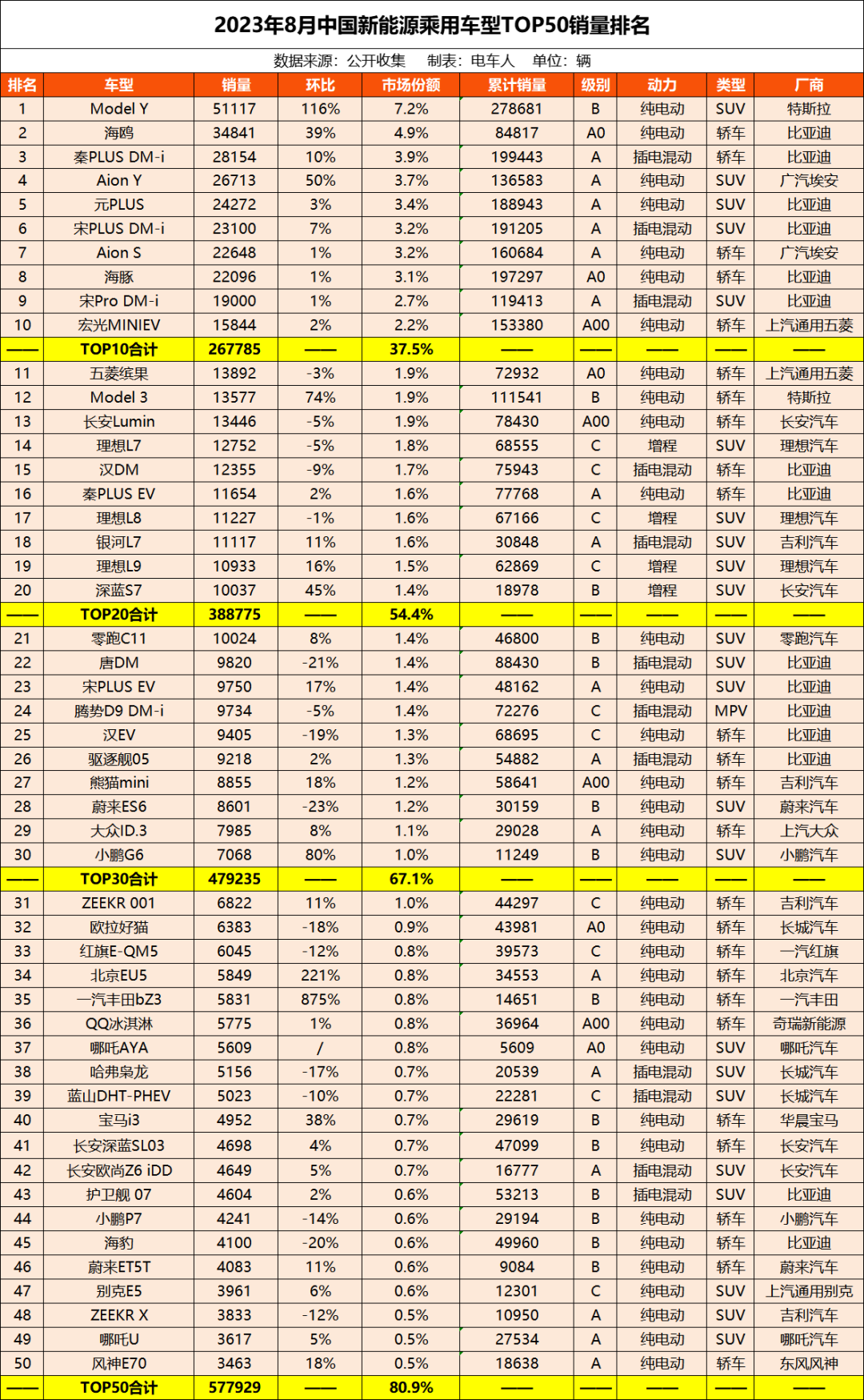 最全!8月份中国新能源乘用车企/车型销量统计分析报告