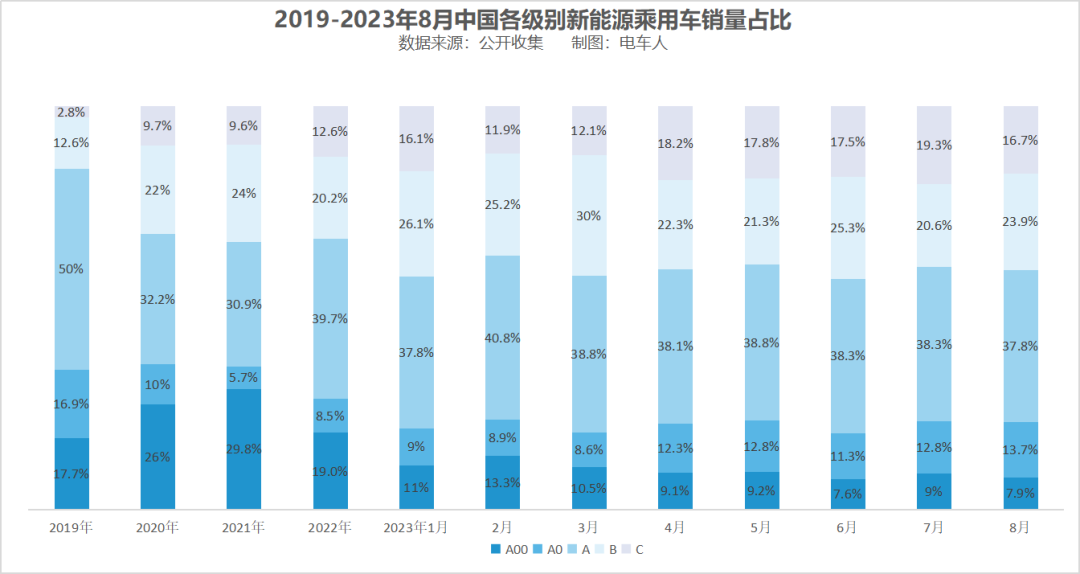 各级别新能源乘用车细分市场中,A00级车市场占比7.9%,较2022年下降了11.1个百分点;A0级车占比13.7%,提升5.2个百分点;A级车占比37.8%,下降了1.9个百分点;B级车占比23.9%,提升了3.7个百分点;C级车占比16.7%,提升了4.1个百分点。