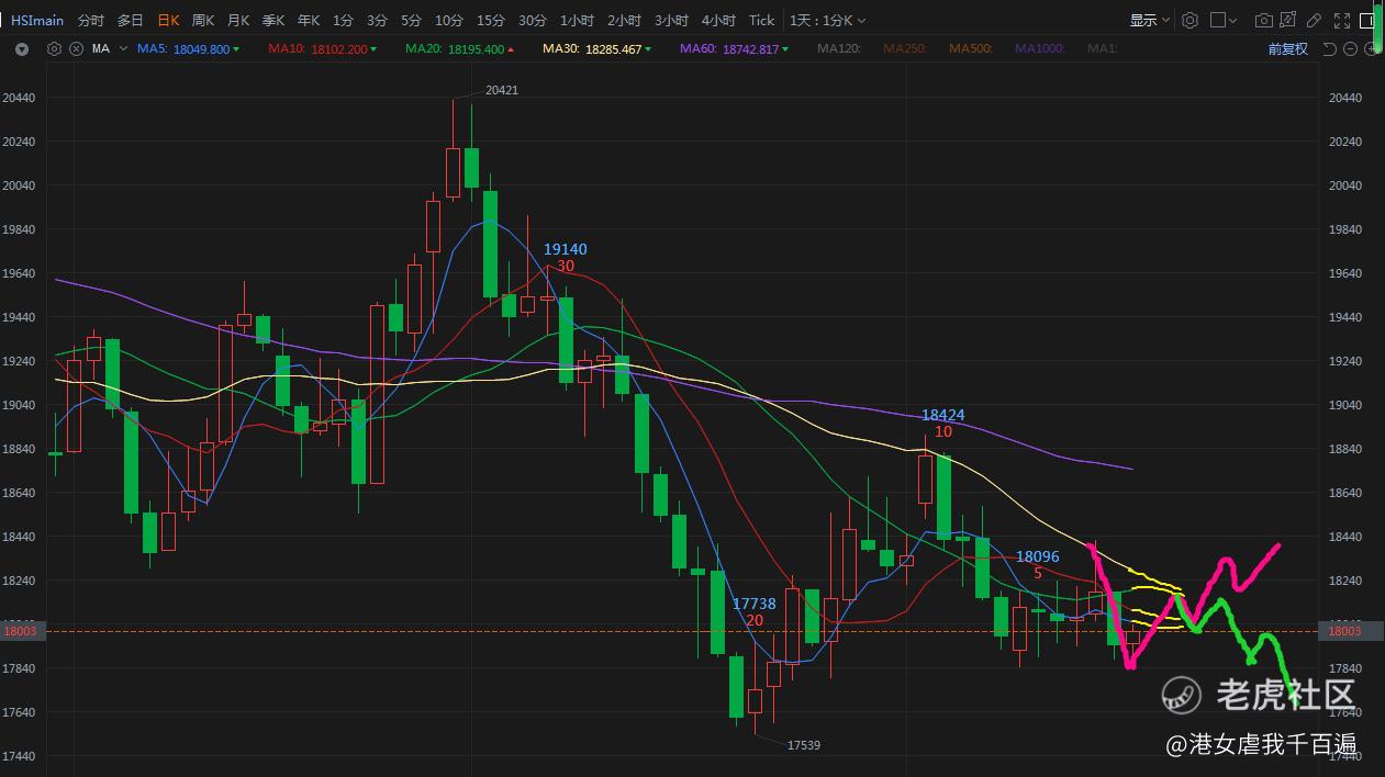 如果没有什么消息出来的话,从时间看,预计恒指最快都要明天晚上才会有比较大的波幅,或者说是有条件上涨的时间,有机会先回到18200这个位置(随着时间,30天线的压力会下移),再去看18410压力。那如果遇到压力后打下来,17850能不能撑住是未知数,届时要留意恒指遇到压力后的走法了,比如遇压后通过横盘消化是不错的表现,而遇压后倒跌那就是弱势的表现了,倒跌的话,后市当然先看175支撑。今晚夜期预计没什么特别,分钟线看有机会先跌下来再反弹,继续区间横震。(大家喜欢红还是绿呢?)