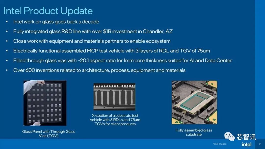 目前英特尔还没有公布这是如何实现的,但英特尔表示,其在玻璃基板方面研究工作可以追溯到十年前,并且已经在亚利桑那州钱德勒投资超过10亿美元建设了全集成玻璃基板研发线;具有3层75um RDL和TGV的电功能组装MCP试验线;填充玻璃通孔,纵横比约20.1,适用于Al和数据中心的lmm核心厚度;已拥有600多项与制造、工艺、设备和材料有关的发明专利;英特尔与设备和材料合作伙伴密切合作,完善生态系统。