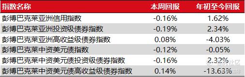 亚洲债券市场表现:彭博巴克莱亚洲信用指数全周回报为-0.16%,彭博巴克莱亚洲投资级债券指数回报为-0.19%,彭博巴克莱亚洲高收益级债券指数回报为0.08%。彭博巴克莱中资美元债指数全周回报为-0.12%,彭博巴克莱中资美元债投资级债券指数回报为-0.16%,彭博巴克莱中资美元债高收益级债券指数回报为0.14%。