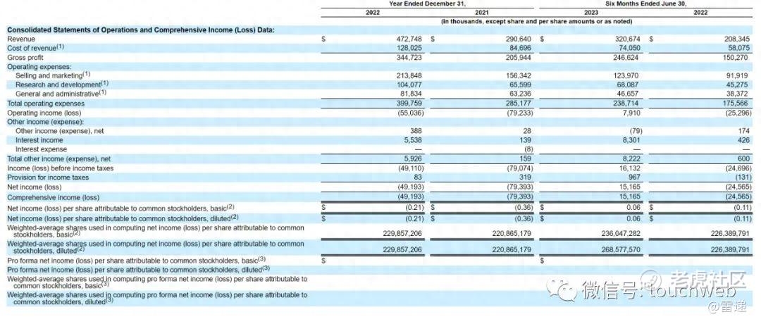 Klaviyo在2023年上半年营收为3.21亿美元,上年同期的营收为2.08亿美元;净利为1517万美元,上年同期的净亏损为2457万美元。