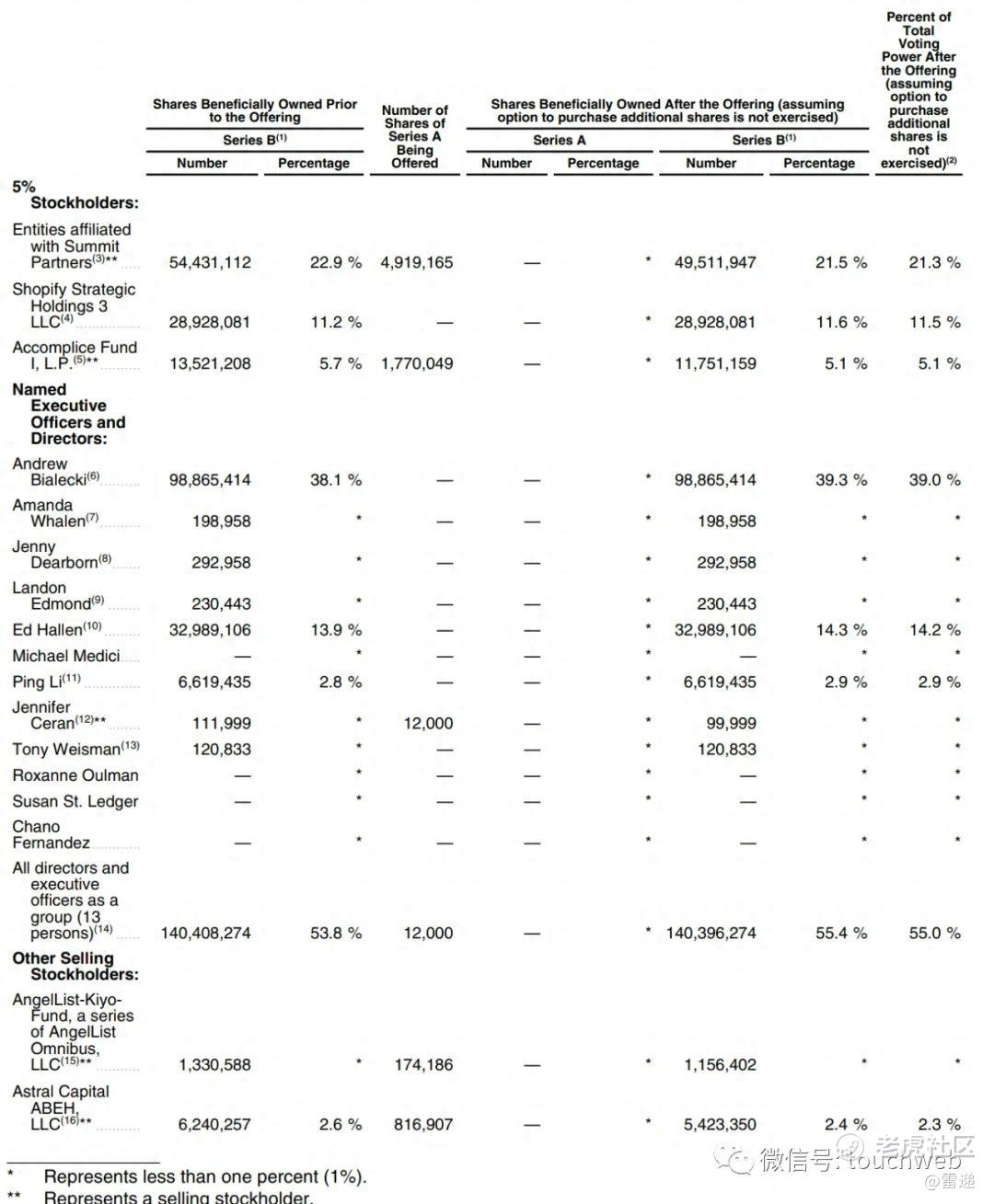 IPO后,Smmit Partners持股21.5%,有21.3%投票权;Shopify持股11.6%,有11.5%投票权,Accomplice Fund I持股5.1%,有5.1%投票权,Andrew Bialecki持股为39.3%,有39%的投票权;