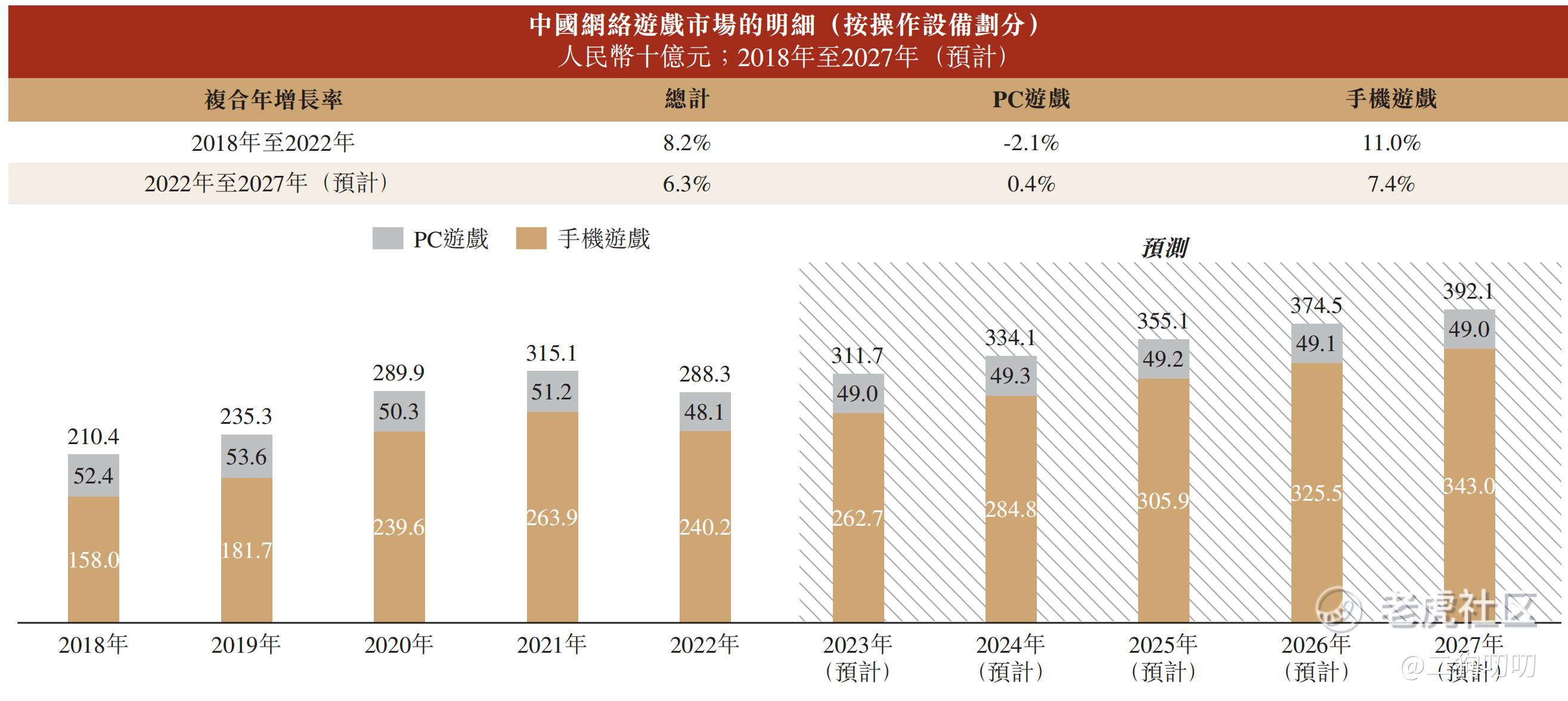 按用户支出计,中国网络游戏市场规模由2018年的人民币2104亿元增加至2022年的人民币2883亿元,复合年增长率为8.2%,并预期将于2027年达到人民币3921亿元,2022年至2027年的复合年增长率为6.3%。其中,按照用户支出来计算的话,手机游戏占2022年网络游戏市场份额的83.3%,也就是手机游戏市场已经全面超过PC游戏市场。