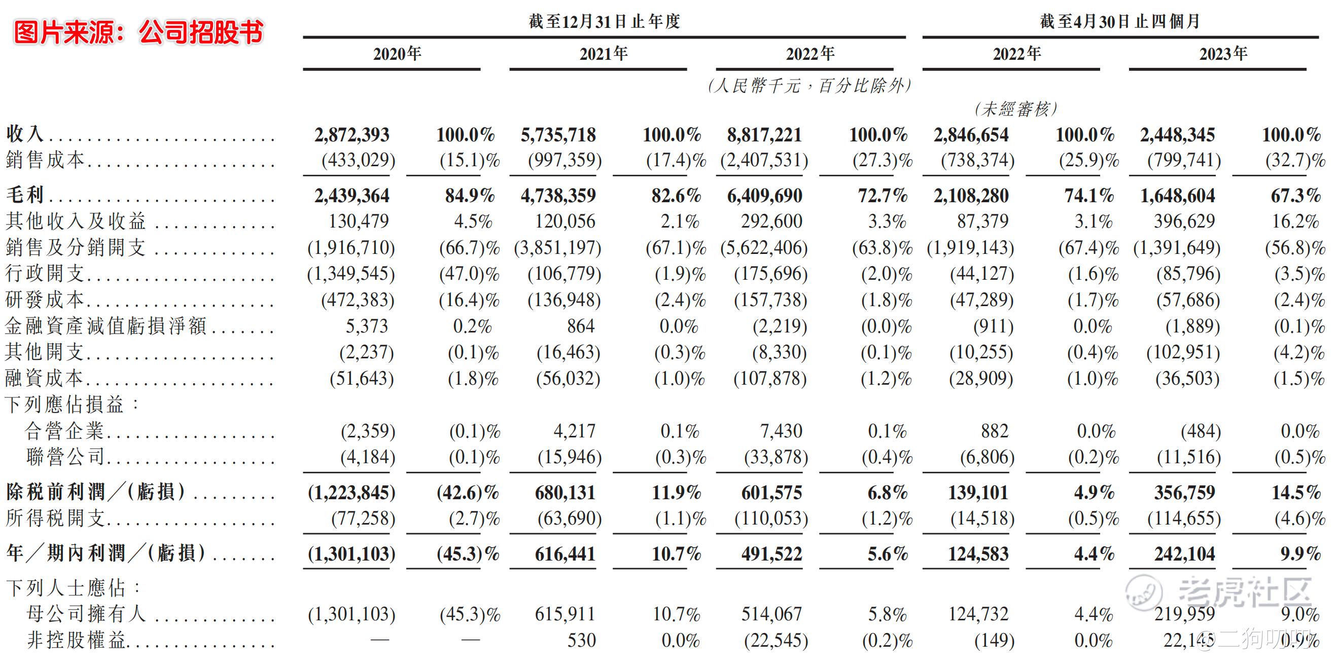 利润方面:公司在2020年、2021年以及2022年期间,实现毛利润分别为24.39亿元、47.38亿元、64.10亿元,年复合增长率为62.1%,同期毛利率利润分别为84.9%、82.6%、72.7%。公司毛利润增速显然低于营收增速,其主要原因便是公司的毛利率接连下降,2023年前四个月公司毛利率已经降到了67.3%。2020年-2022年公司净利润分别为-13.01亿元、6.16亿元、4.92亿元,净利润也是逐年减少,增收不增利,看来公司在营销方面花费真是不少啊。