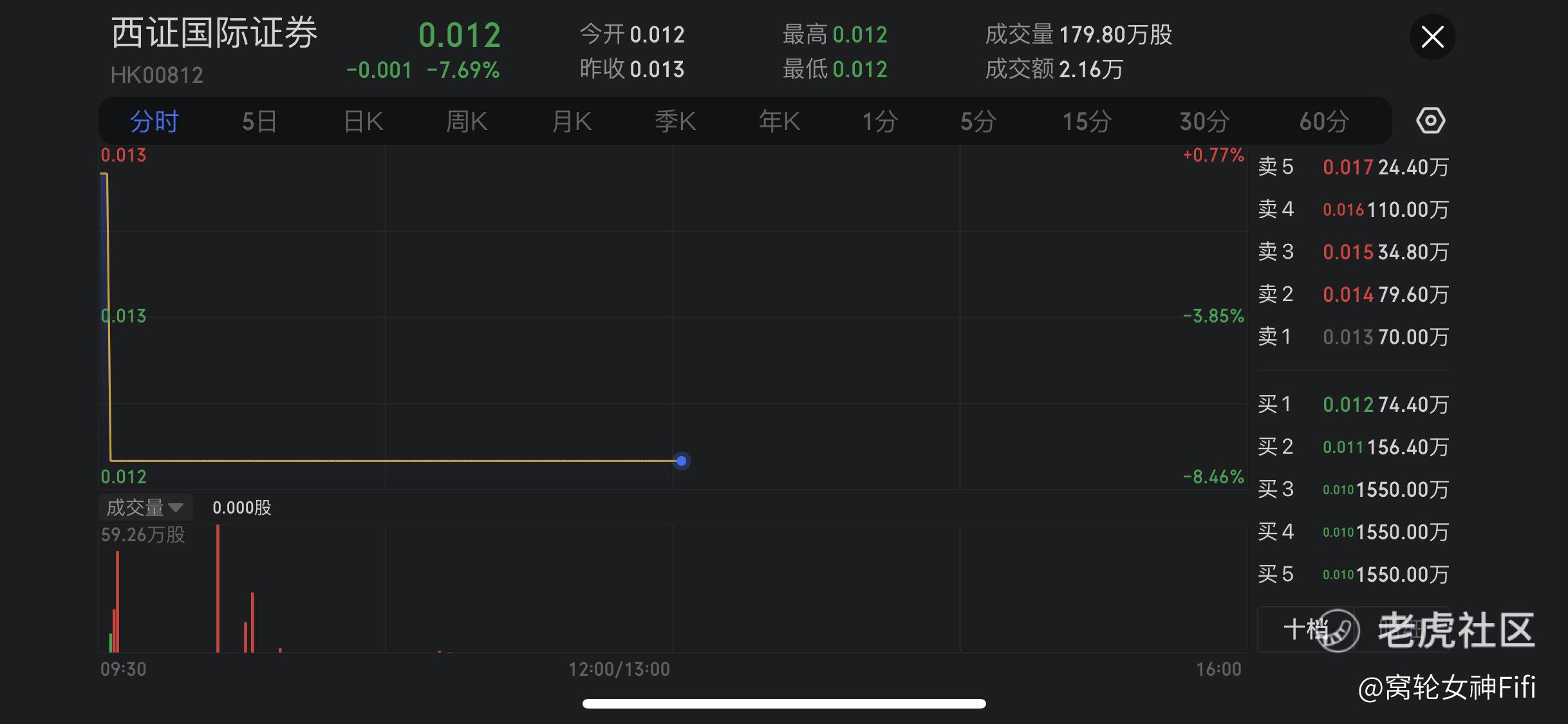 $西证国际证券(00812)$ 跌超7%,截止发稿跌7.69%,报0.012港元,成交额2.16万港元。