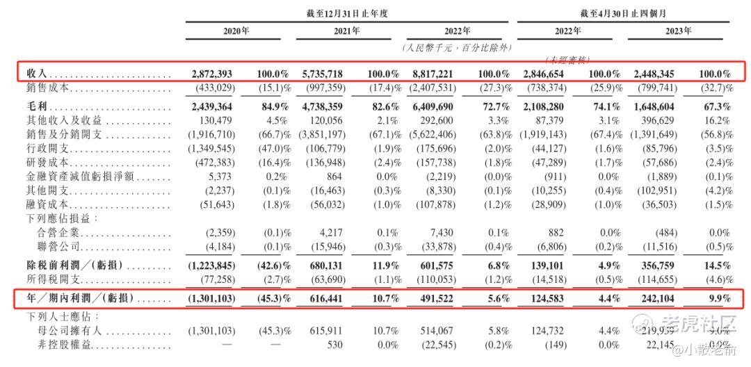 接下来看看公司经营情况,公司从2020~2022年的营业收入分别是28.72亿、57.36亿,88.17亿,2022年营收同比增长53.72%;2020~2022年的净利润分别是-13.01亿、6.16亿,4.92亿,2022年的净利润同比增长-20.26%