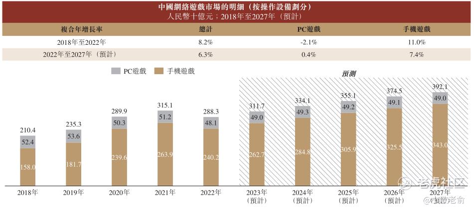 网络游戏根据操作设备可分为PC游戏及手机游戏。按用户支出计,中国网络游戏市场规模由2018年的人民币2,104亿元增加至2022年的人民币2,883亿元,复合年增长率为8.2%,并预期将于2027年达到人民币3,921亿元,2022年至2027年的复合年增长率为6.3%。按用户支出计,手机游戏占2022年网络游戏市场的83.3%。