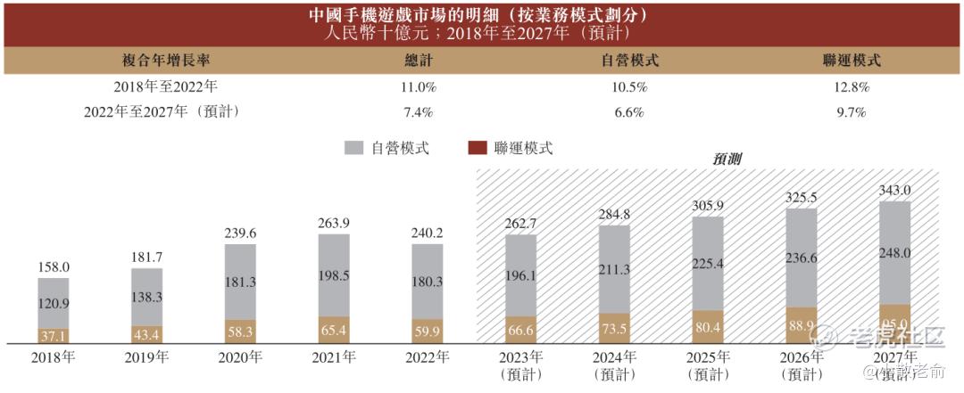 自营模式下的手机游戏近年点手机游戏市场的大部分,但联运模式下的手机游戏市场规模迅速增长。联运模式下的手机游戏市场规模以12.8%的复合年增长率快速增长,由2018年的人民币371亿元增加至2022年的人民币599亿元,并预期于2027年将达到人民币950亿元,2022年至2027年的复合年增长率为9.7%。