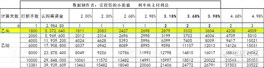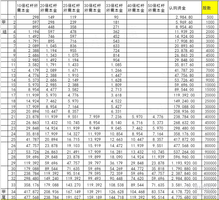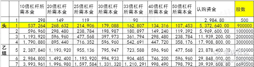 乙组头,这次是 538万本金,乙组的各档融资所需要的本金还有融资金额对应如下表: