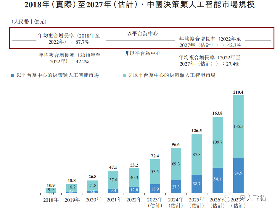 中国人工智能行业可按照应用范畴分为四大领域:决策类人工智能、视觉人工智能、语音及语义人工智能和人工智能机器人。以2022年收入计,我们在中国以平台为中心的决策类人工智能市场(人工智能市场中的一个细分领域)占据最大市场份额。