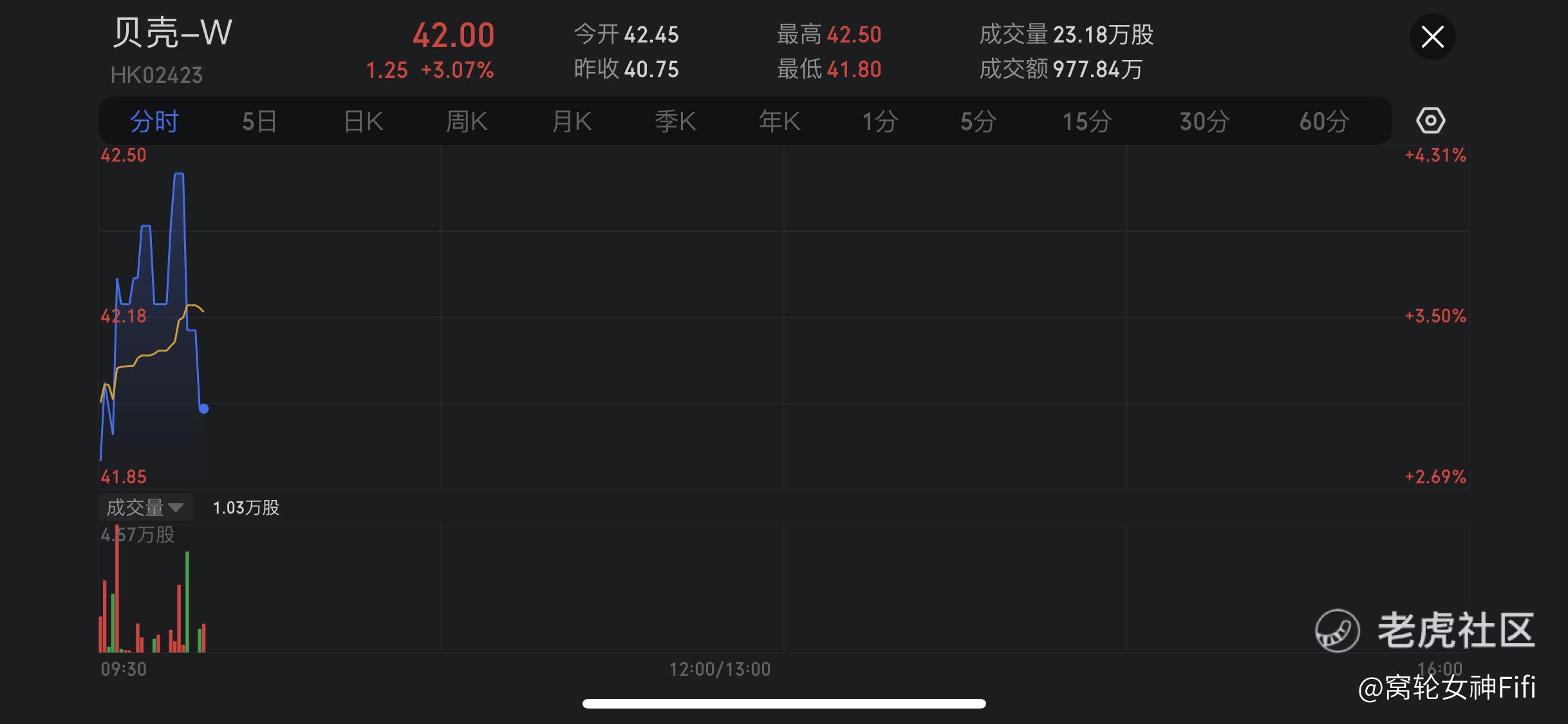 $贝壳-W(02423)$ 早盘涨超4%,截至发稿,涨3.07%,报42港元,成交额977.84万港元。