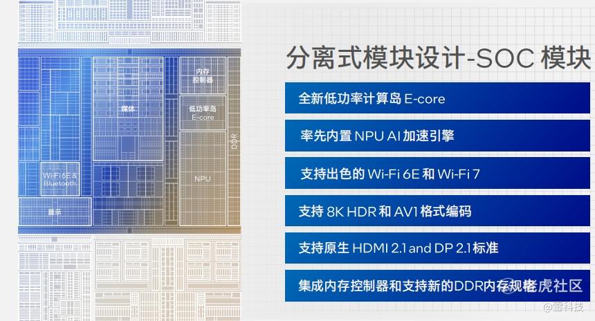最后来看看SoC模块,这是Meteor Lake处理器本次更新最大的变化,在SoC模块中英特尔采用了全新的低功耗岛设计,集成了神经网络处理单元(NPU),新的低功耗能效核,进一步优化节能与性能间的平衡。SoC 模块还集成了内存控制器、媒体编解码处理和显示单元,支持 8K HDR 和 AV1 编解码器以及 HDMI 2.1 和 Display Port 2.1 标准,还支持Wi-Fi 、 Bluetooth和 Wi-Fi 6E。