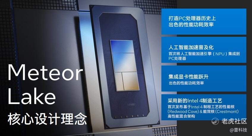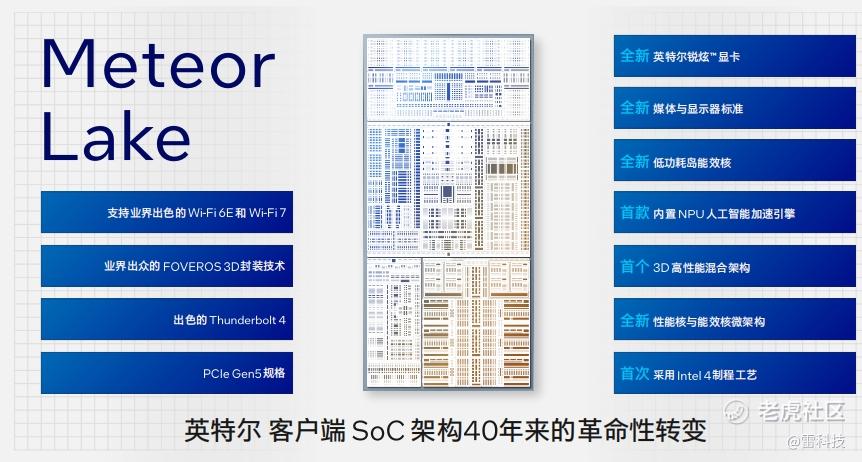 2023年9月19日,英特尔正式发布基于Intel 4制程工艺的首个处理器平台——Meteor Lake。得益于先进的Foveros 3D封装技术,Meteor Lake实现了全新的分离式模块结构,将传统的单处理器设计分为多模块设计,Meteor Lake的处理器将由计算模块、IO模块、SoC模块、图形模块,通过全新的架构打造出能耗比更出色的处理器。