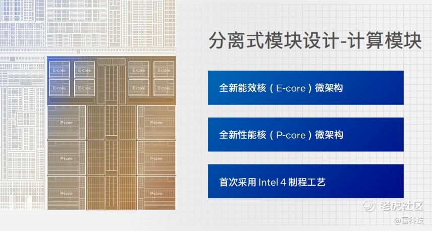 而Meteor Lake架构则采用了分离式的模块设计,所以,虽然掀开顶盖你依然只会看到一个芯片,实际上芯片里封装了四个独立模块,它们共同组成一个处理器。其中,计算模块就是以前的处理器核心,内置最新一代的能效核及性能核,通过制程工艺及微架构的更新,进一步强化了性能,带来更高的能耗比。
