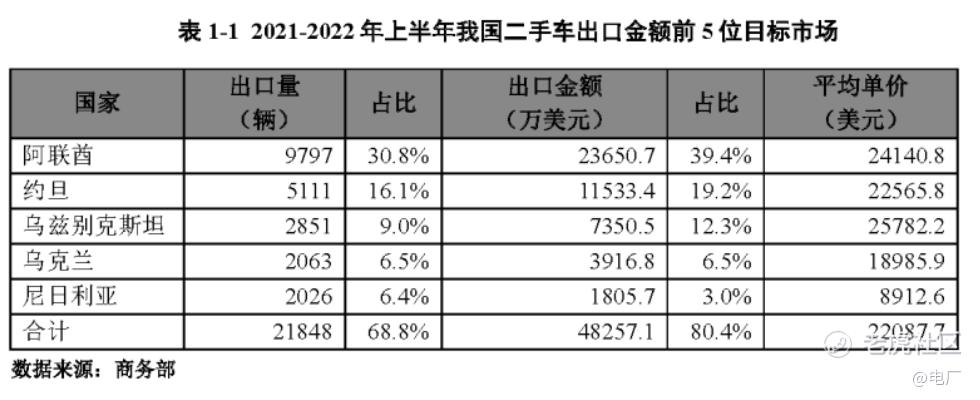 更重要的是,二手车出口还是一个很零散的生意,当前,大家主要都集中在中亚、中东等二手车中转中心,或者一带一路等沿线市场。根据商务部统计,从2021年至2022年上半年,阿联酋、约旦、乌兹别克斯坦、乌克兰、尼日利亚5大二手车目标市场出口量集中度已经达到68.8%,而出口规模的集中度更高达80.4%。