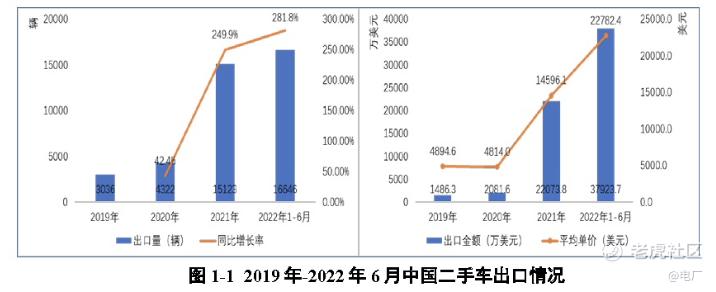 这一点也可以从商务部的官方统计数据得到印证。从2019-2021年,国内二手车出口总量分别为3036辆、4322辆、1.5万辆,年复合增长率为123%,对应的出口金额为1486万美元、2082万美元、2.2万亿美元,年复合增长率为285%,其中,2021年的出口规模增速为250%、出口金额增速高达960%。