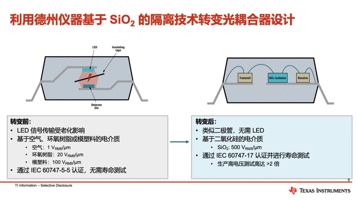 在TI看来,不仅是要提升隔离产品的可靠性,而且应该消除不必要的所谓“超裕度设计”(overdesign)起到系统设计的优化效果。这里overdesign的存在,主要是因为传统光耦合器特性使然——光耦合器是针对系统信号做电气隔离的常规选择。