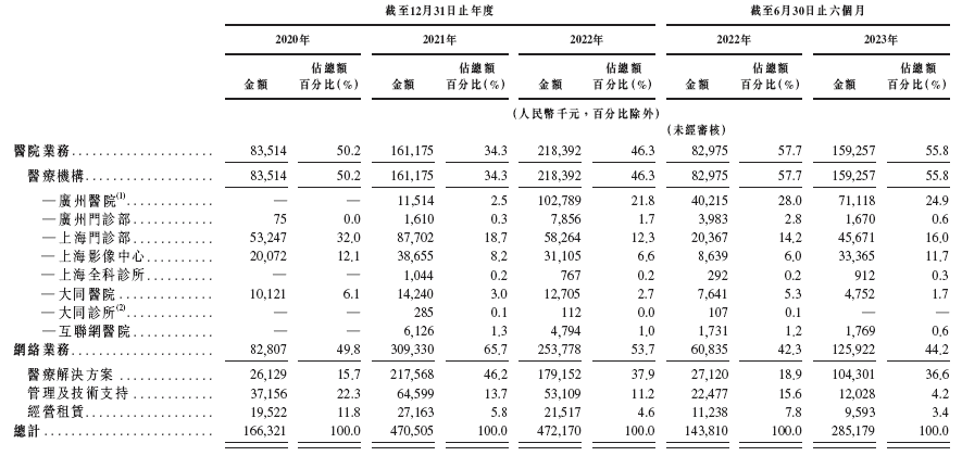 美中嘉和的收入来自医院业务、网络业务。医院业务收入指来自自营医疗机构的收入,网络业务指来自医疗解决方案、管理及技术支持以及经营租赁的收入。