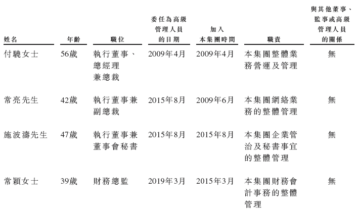 高管包括董事长兼执行董事杨建宇博士,执行董事、总经理兼总裁付骁女士,执行董事兼副总裁常亮先生,执行董事兼董事会秘书施波涛先生,财务总监常颖女士。