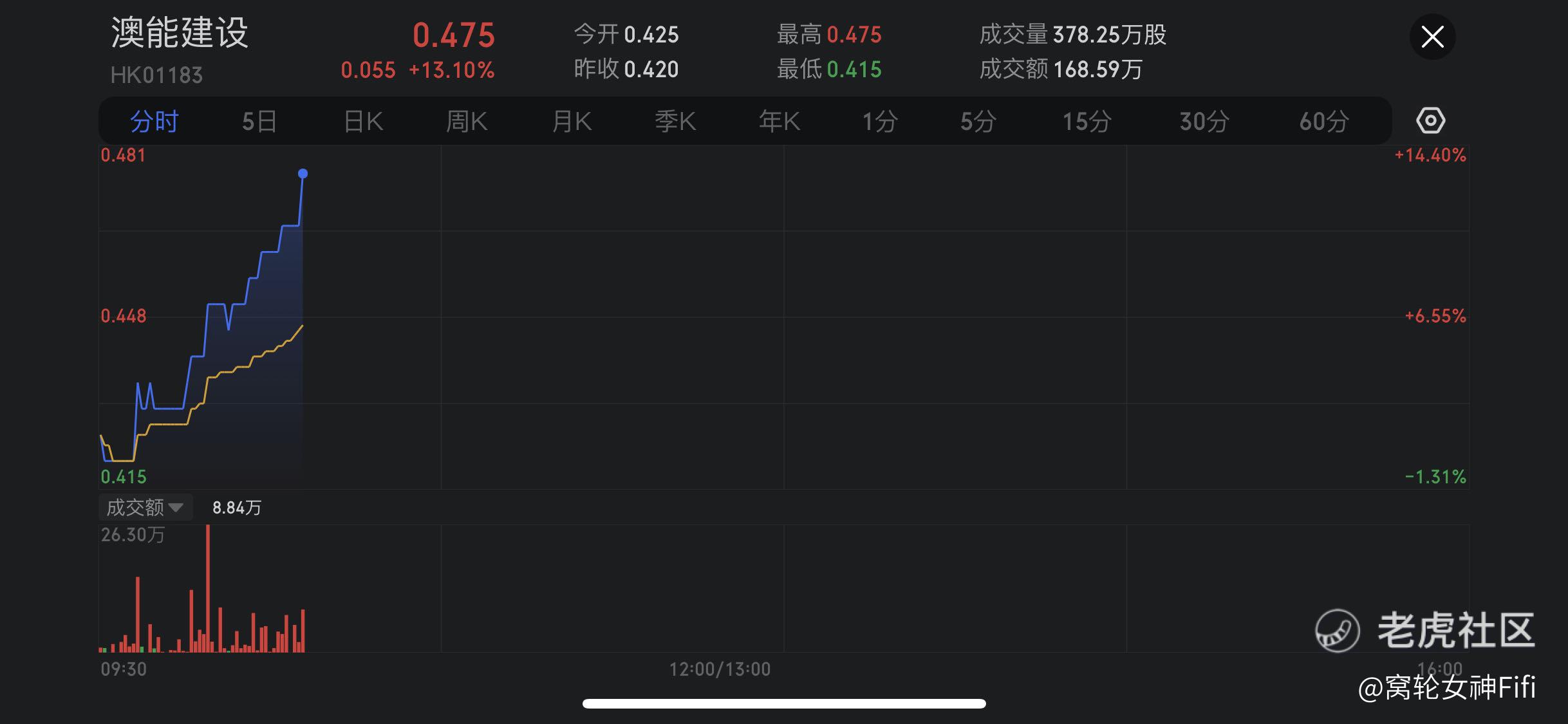 $澳能建设(01183)$ 涨超13%,截至发稿,涨13.1%,报0.475港元,成交额168.59万港元。