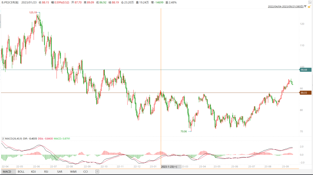 第一点体现在联储对于美国经济的预期上,不仅提高了对于GDP的预期,也降低了明年降息幅度的预期。虽然按照历史经验去看,联储在加息末期的经济预测不一定准,但这依然给市场带来了一些干扰。坦率说,美国经济最近是有一些疲态的,在出现一些放缓迹象的时候,联储给出非常乐观的看法,市场是比较迷茫的。但胳膊拗不过大腿,尤其拗不过油价,所以虽然疑惑,但市场接受了联储的鹰派表态