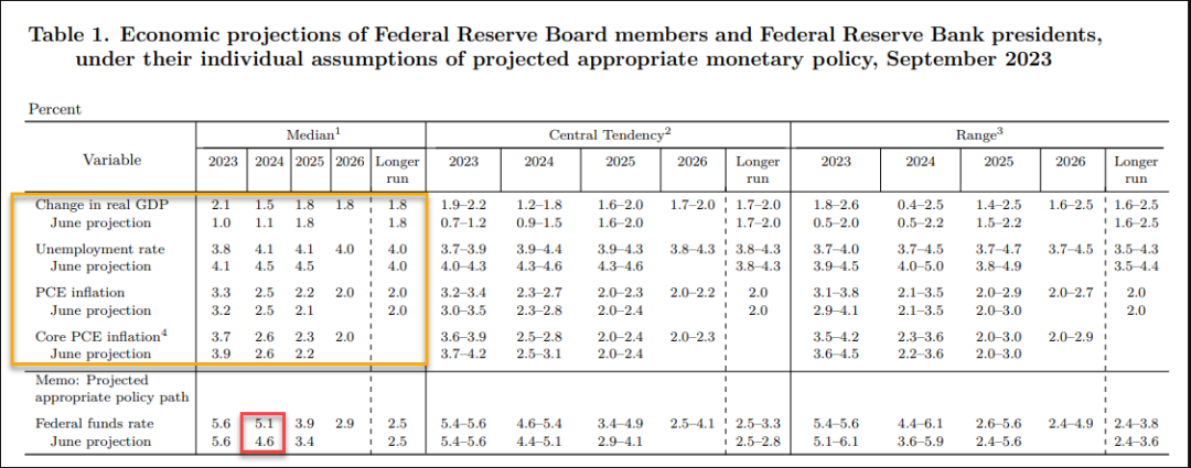 可以看到,联储对于2024年美国GDP的增速预期从六月份的1.1%,提高到了1.5%,对比前几天说过的欧央行是下调了经济预测,所以这个从国际对比来看是鹰派的。