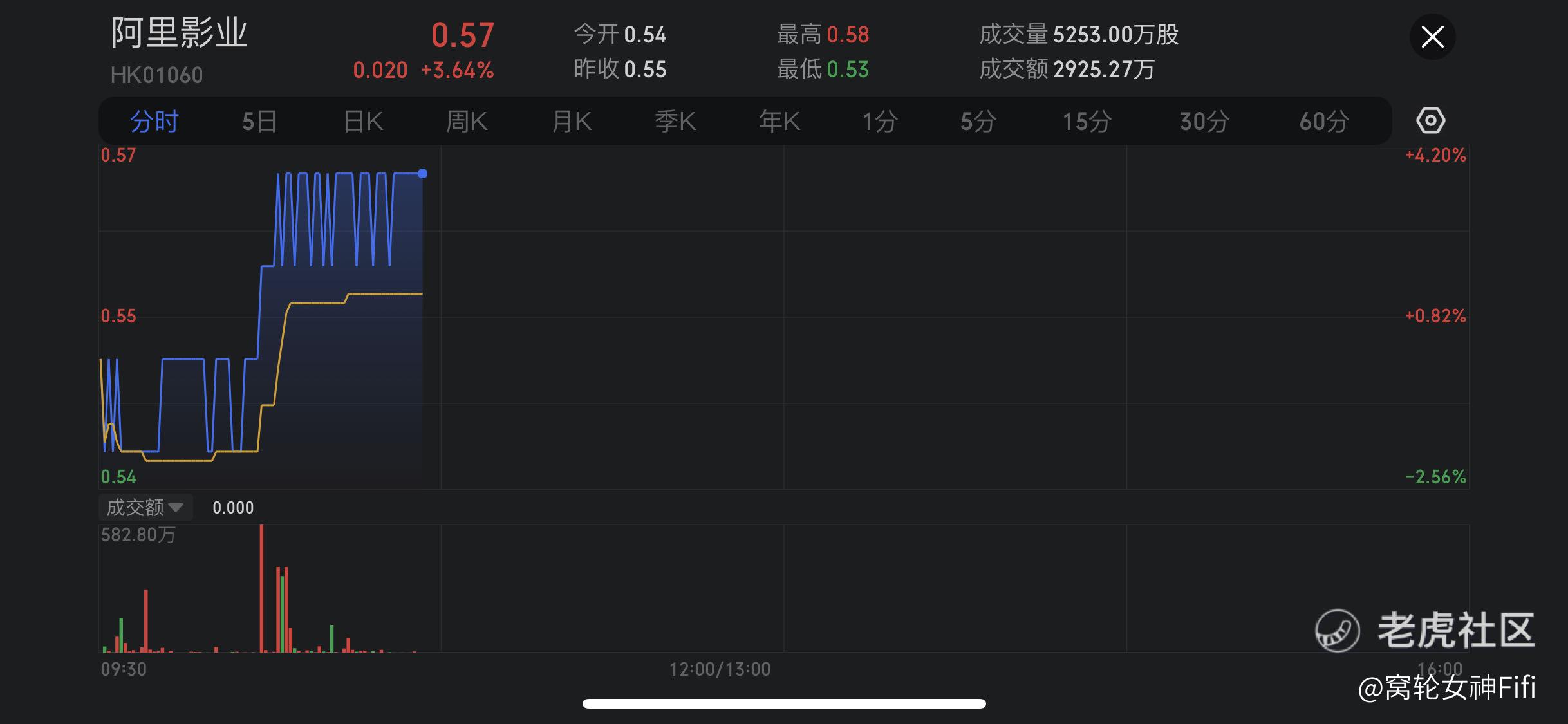 $阿里影业(01060)$ 现涨近4%,截至发稿,涨3.64%,报0.57港元,成交额2925.27万港元。
