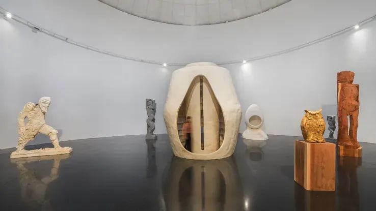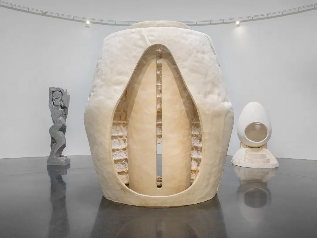但是豪斯雅戈做到了,可以说是轻而易举地让场地和作品浑然一体。9件作品中,7件是雕塑2幅是绘画作品,都有直顶云霄的快意恩仇。身材魁梧的艺术家曾经有过建筑工人的经历,他在2006年的时候,还在洛杉矶从事建筑工作维持生计,并且据说是精通电弧焊以及搅拌混凝土。所以他的作品:从草图演变成蛋壳状的《给孩童和爱人的雕塑》以及《爱人(圆屋)》都是采用了钢筋以及石膏等材料。这两个大到可以装进两个人的沉浸感雕塑作品,相信会成为观众排队体验的网红话题。钻进作品里面,去感受一下石膏子宫的沉浸,应该对于所有人来说都是一次非常新奇的感受。