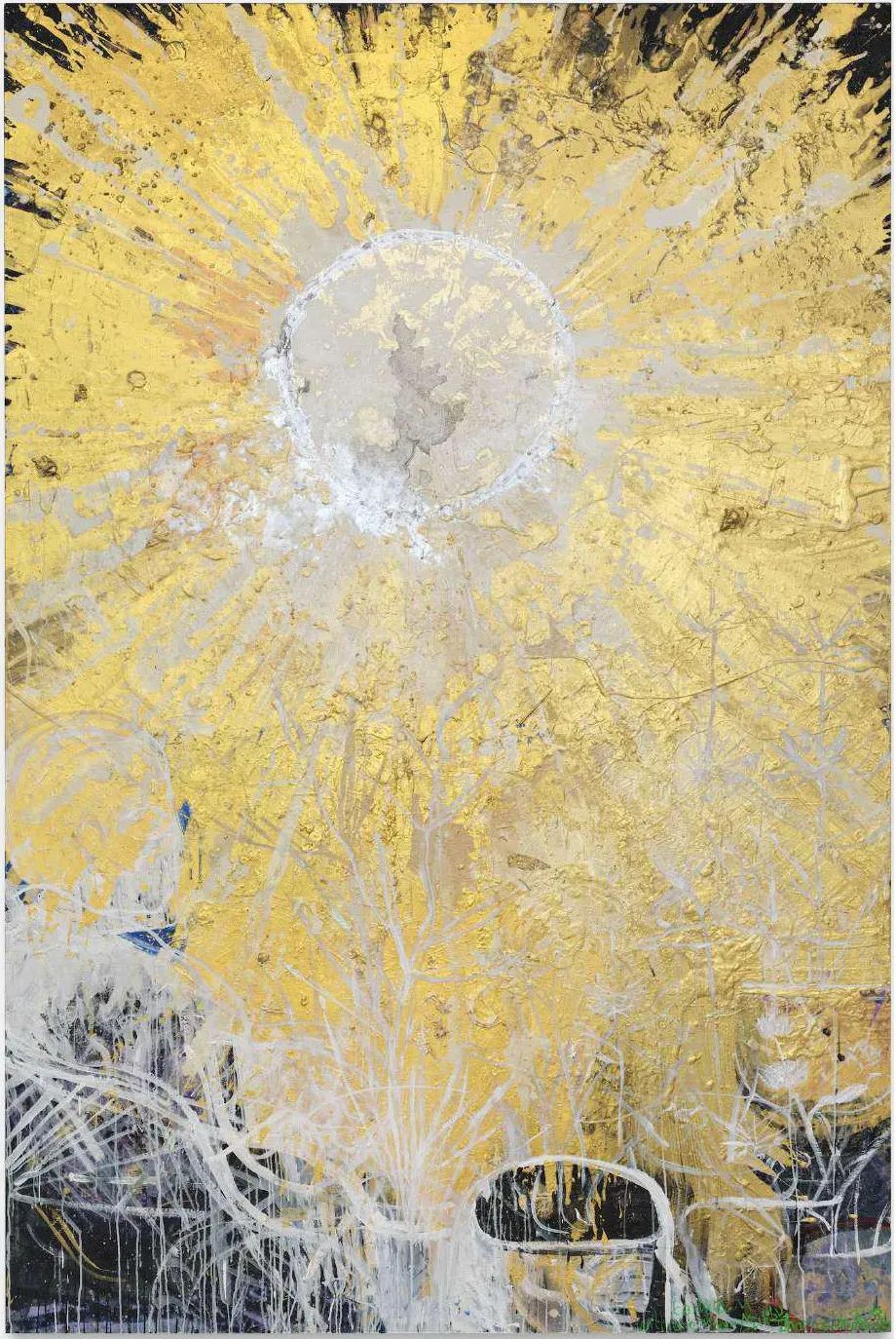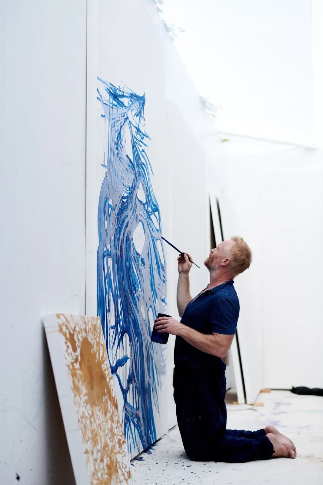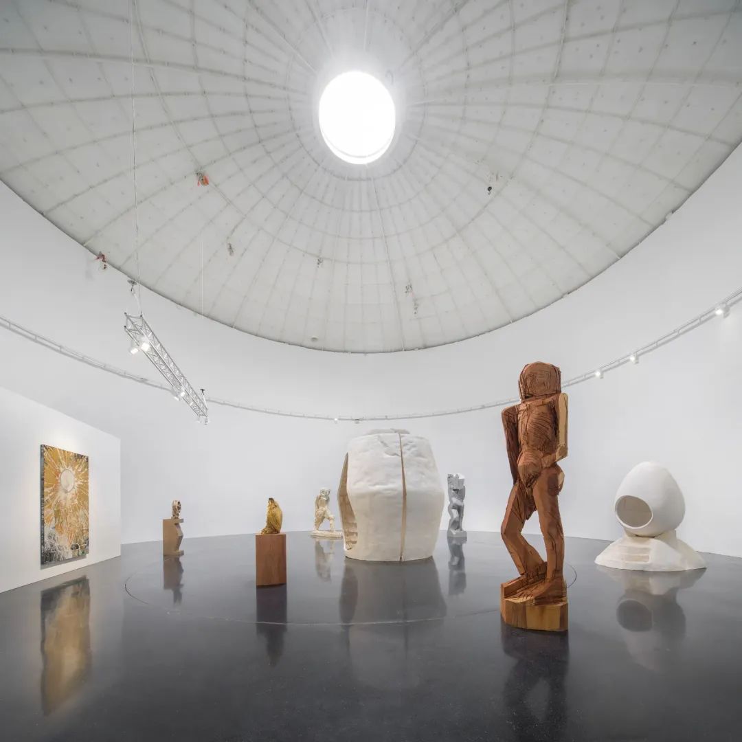 文丨范庭略在油罐艺术中心看了这么多次展览,我第一次跑到社交网络上去关注了一位艺术家,以此满足自己的好奇心和窥视欲,并且希望能在碎片式的信息中捕捉到艺术家更为丰富的艺术背景。我通过他日常生活的阅读篇章以及他常听的音乐进入了他的世界,居然好像钻进了一个充满迷幻感觉的兔子洞。在他常去的Mixcloud的DJ直播录音中居然波涛汹涌的浪了一个晚上。这位艺术家,就是近期在上海油罐艺术中心巨大的穹顶之下登场的英国雕塑艺术家托马斯•豪斯雅戈(Thomas Houseago)。豪斯雅戈穿着深蓝色亚麻西装,和我一起搂着那个五十多公分高的青铜猫头鹰合影,随意地将一只手插在口袋里面,然后告诉我要看着对面那幅著名的《马里布的月光2023》,强调猫头鹰在这片令人眩目的月光之中发生了电闪雷鸣一般的神奇交流。他激动地讲解,二头肌孔武有力,让我感到很多时候那些巨大的雕塑创作工作毫无疑问也是一个体力活儿。油罐艺术中心的T馆展厅是个神奇的地方,这里有巨大的挑高,类似教堂穹顶一样的浑圆空间上方有一个圆形开口的玻璃窗,让白天的阳光照耀进来。虽然展厅里面灯光通明,但是仰望的时候可以看到蓝天,再低下头的瞬间,目光所及的都是巨大的艺术作品,这一瞬间的撞击颇为美好。因此在这个空间内举办的展览,都是重要、有分量的作品,如此才可以压得住类似神殿一样的场地。上一次产生这样美好的观看效果的是贾霭力的巨幅油画,那种不在现场亲眼所见的大尺幅的震撼,来自于艺术家对于画面熟练的驾驭能力以及一种让人瞠目结舌的真诚,想到那句“天地有大美而不言”的片儿汤话,才知道真的有此种被征服的感觉。此后,这里也举办过其他几位艺术家的展览,几乎每一位都似乎要竭尽全力将地面与穹顶那个小窗户勾连起来,可惜还是差了一口气。
